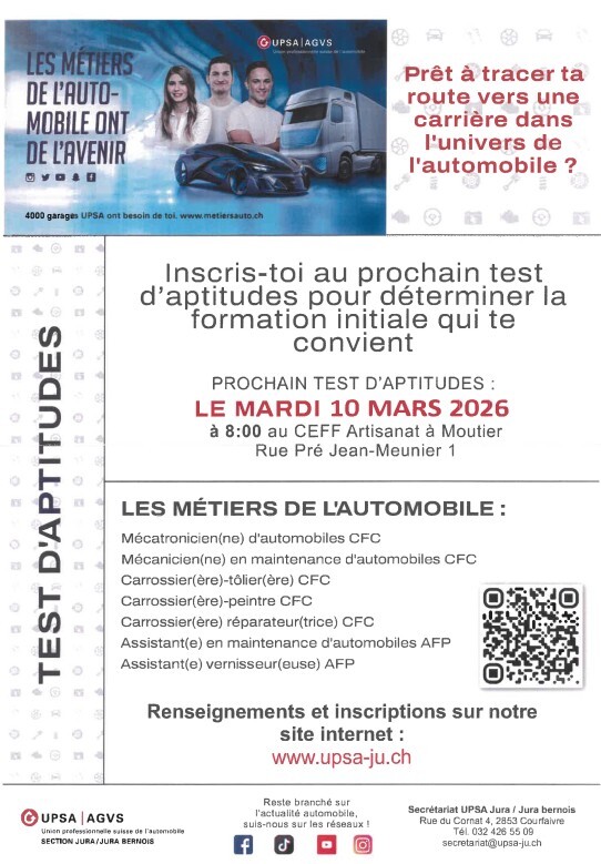 Viens tester tes compétences grâce aux tests d'aptitudes programmés par l'UPSA, quatre fois par année au Jura. Ils t'aideront à mieux connaître tes forces et à choisir le métier fait pour toi.